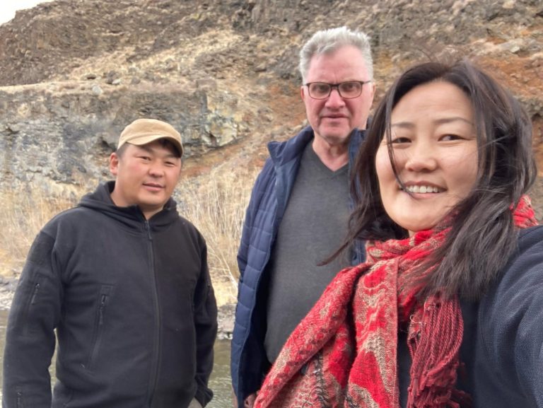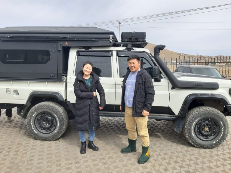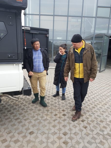 Auf dem Hof unseres Fahrzeugstützpunktes am Stadtrand von Ulan Bataar treffen wir uns mit unserer Dolmatscherin Tuul und unserem Guide Kishi um Touren für die Saison 2026 zu erkunden.