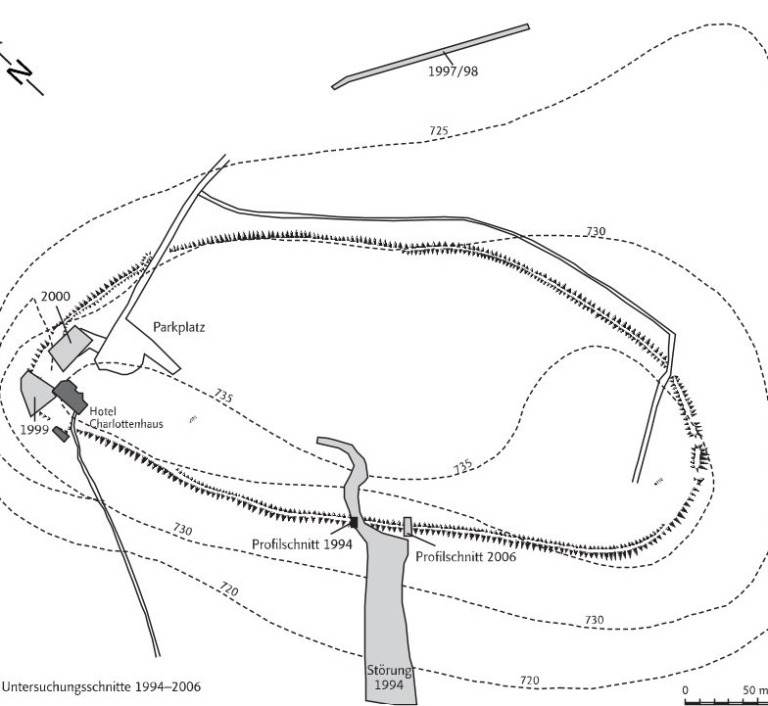 in den Jahren 1994 und 2006 angelegte Wallschnitte erbrachten den Nachweis einer zeit- und kulturtypisch in Stein und Holz aufgeführten Befestigungskonstruktion. Über befundgebundene Keramik ergibt sich